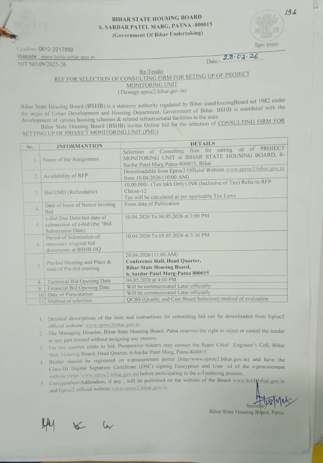 BIHAR STATE HOUSING BOARD, PATNA, BIHAR, invites proposals from eligible firms to “Selection of a Consultant for Project Management Unit (PMU) for Bihar State Housing Board”